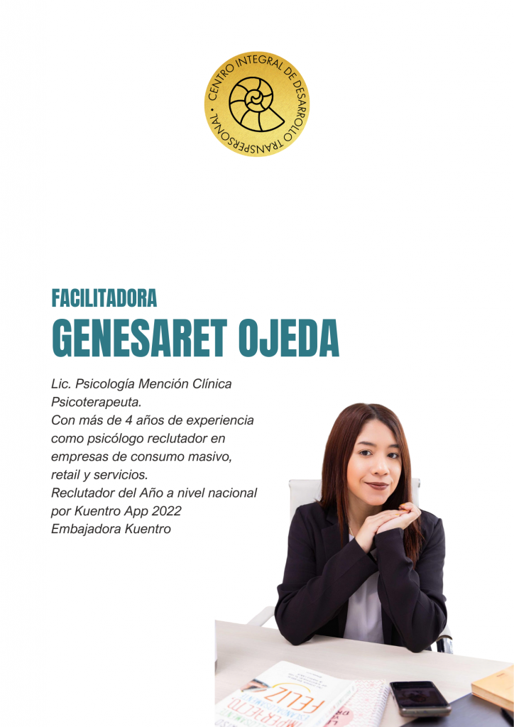 Serás guiado por Genesaret Angulo Ojeda y Gabriel Pérez, Psicólogos Mención Clínico, Psicoterapeutas y Reclutadores expertos. Aprenderás la evaluación no solo desde la teoría, sino desde la experiencia real en el campo organizacional y clínico.